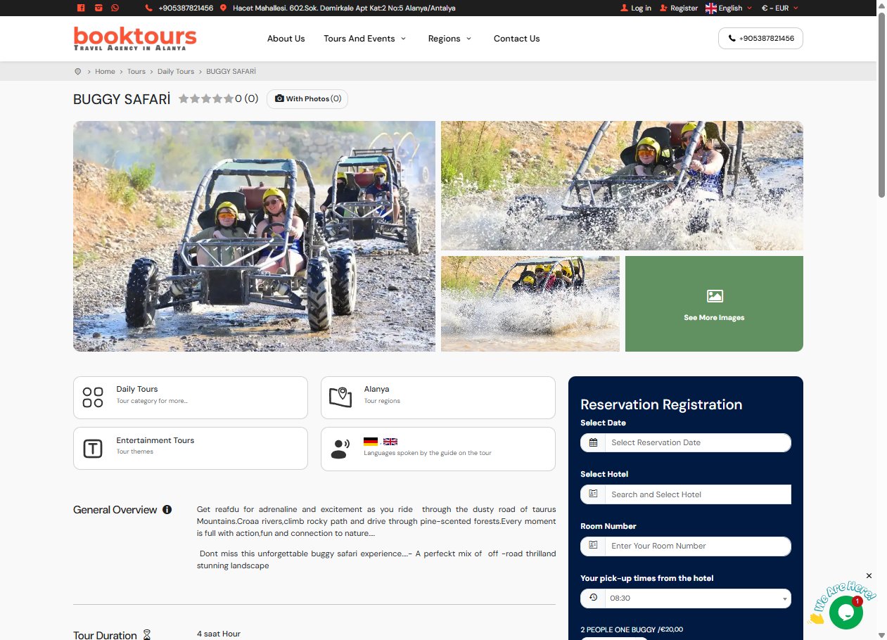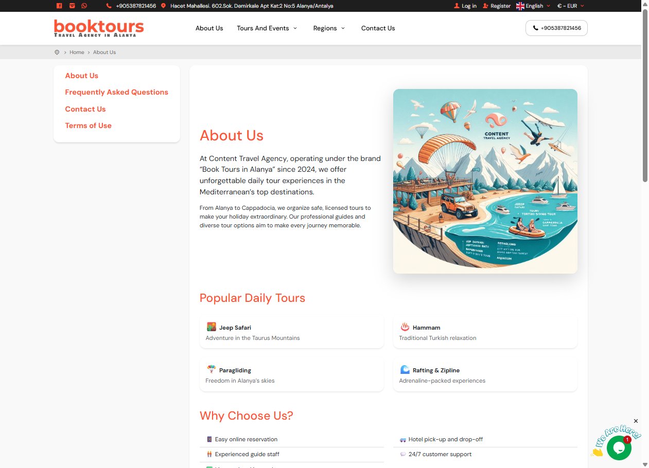 Evcimo Tech Tur Yazılımı kullanılarak geliştirilen bu turizm sitesi, 4 dilde hizmet sunabilen ve 10 dile kadar genişletilebilen altyapıya sahiptir. Mobil uyumlu tasarımı sayesinde farklı cihazlarda sorunsuz çalışırken, üyelik veya misafir modu ile esnek rezervasyon deneyimi sunmaktadır. Küçük ve orta ölçekli bir işletme için ideal bir çözüm olan platform, kullanıcı dostu yönetim paneli ve temel SEO optimizasyonu ile profesyonel bir dijital varlık sağlamaktadır.