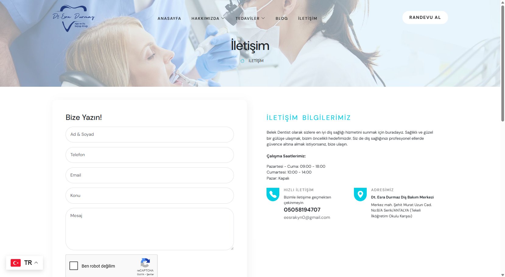 Dt. Esra Durmaz Diş Kliniği için geliştirilen profesyonel web platformu; çok dilli altyapısı, dinamik içerik yönetimi, hizmetler, müşteri yorumları, blog ve ekip listesi gibi özelliklerle donatılmıştır. Yönetim paneli üzerinden tüm içeriklerin kolayca güncellenebildiği bu platform, kliniğin kurumsal kimliğini güçlendiren modern ve kullanıcı dostu bir dijital çözüm sunmaktadır.