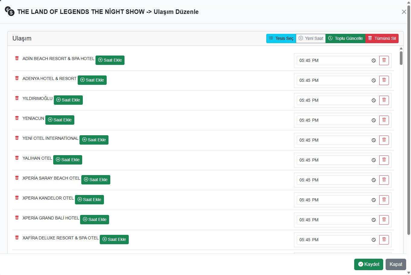 Hazır otel listelerinden seçim yapın veya kendi adreslerinizi yazın. Otel alım saatleri belirleme imkanı.